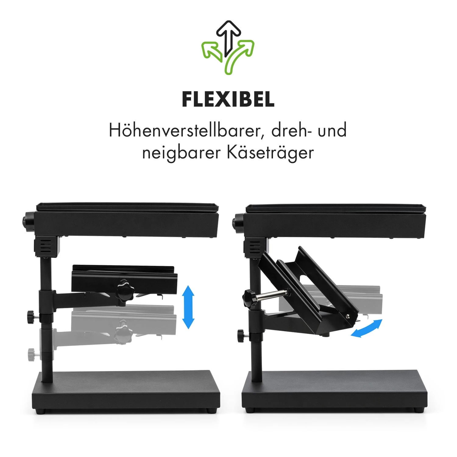 So genießt man Raclette auf traditionelle Art: Edel gereifter Käse, vom Block geschmolzen und auf Baguette, Kartoffeln oder Fleisch verteilt. Dazu wird der Käse direkt im Käseträger eingespannt und unter dem 1000 Watt starken Heizelement positioniert. Per Höhenverstellung bestimmt man unkompliziert, wie schnell der Käse eine cremige Konsistenz erlangt. Der Käseträger lässt sich zudem seitlich schwenken sowie horizontal kippen, um den Käse ganz einfach und komfortabel auf dem jeweiligen Teller zu verteilen. Natürlich kann die Heizleistung über den integrierten Thermostatschalter eingestellt werden: Wer den Käse lieber dunkler mag, stellt die Temperatur einfach höher ein.