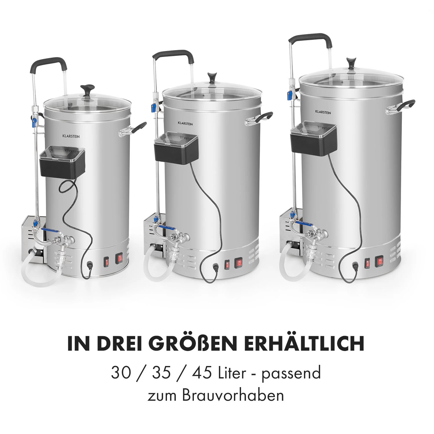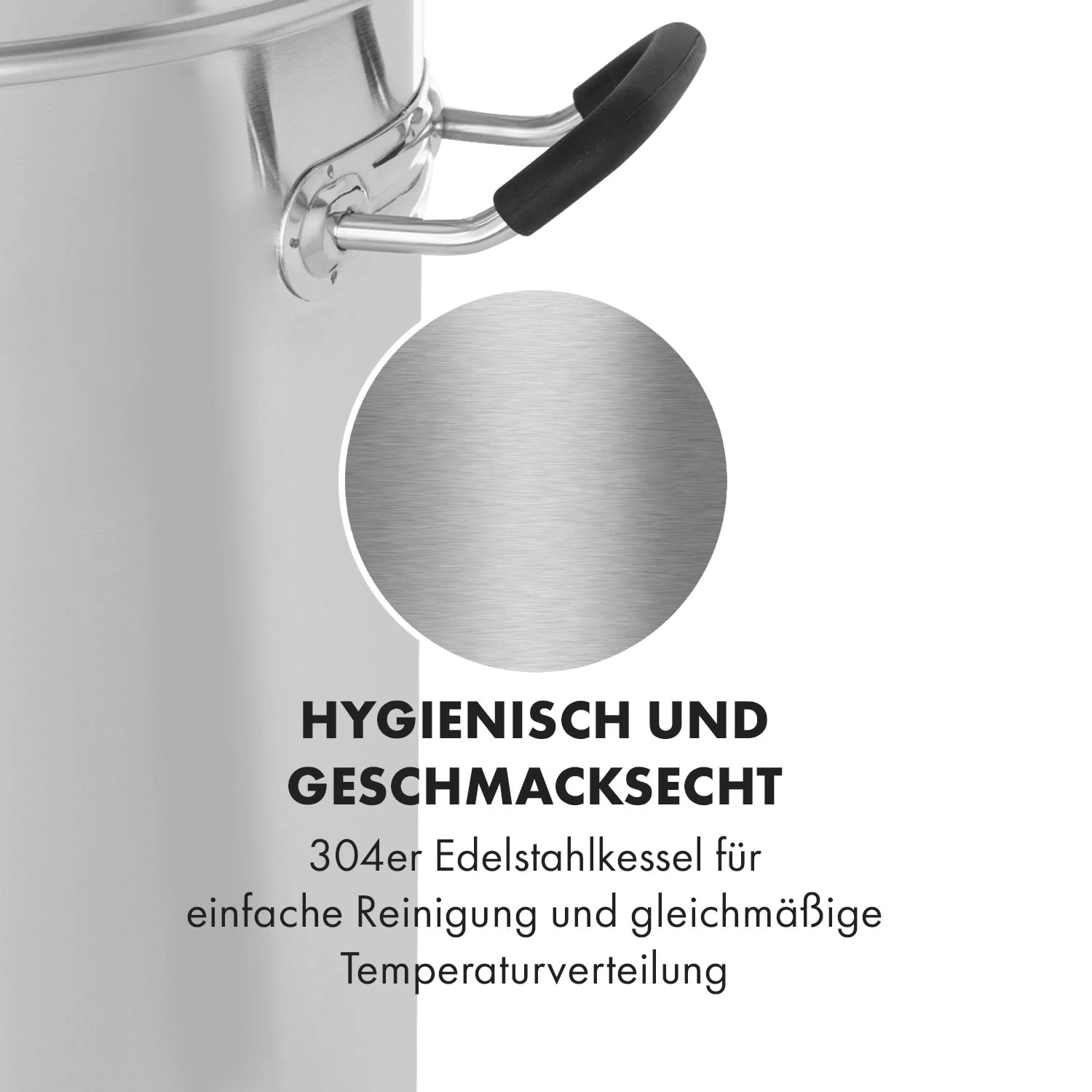 - Volumen des Kessels: 25 / 30 Liter (Flüssigkeit mit Malz / nur Flüssigkeit)
