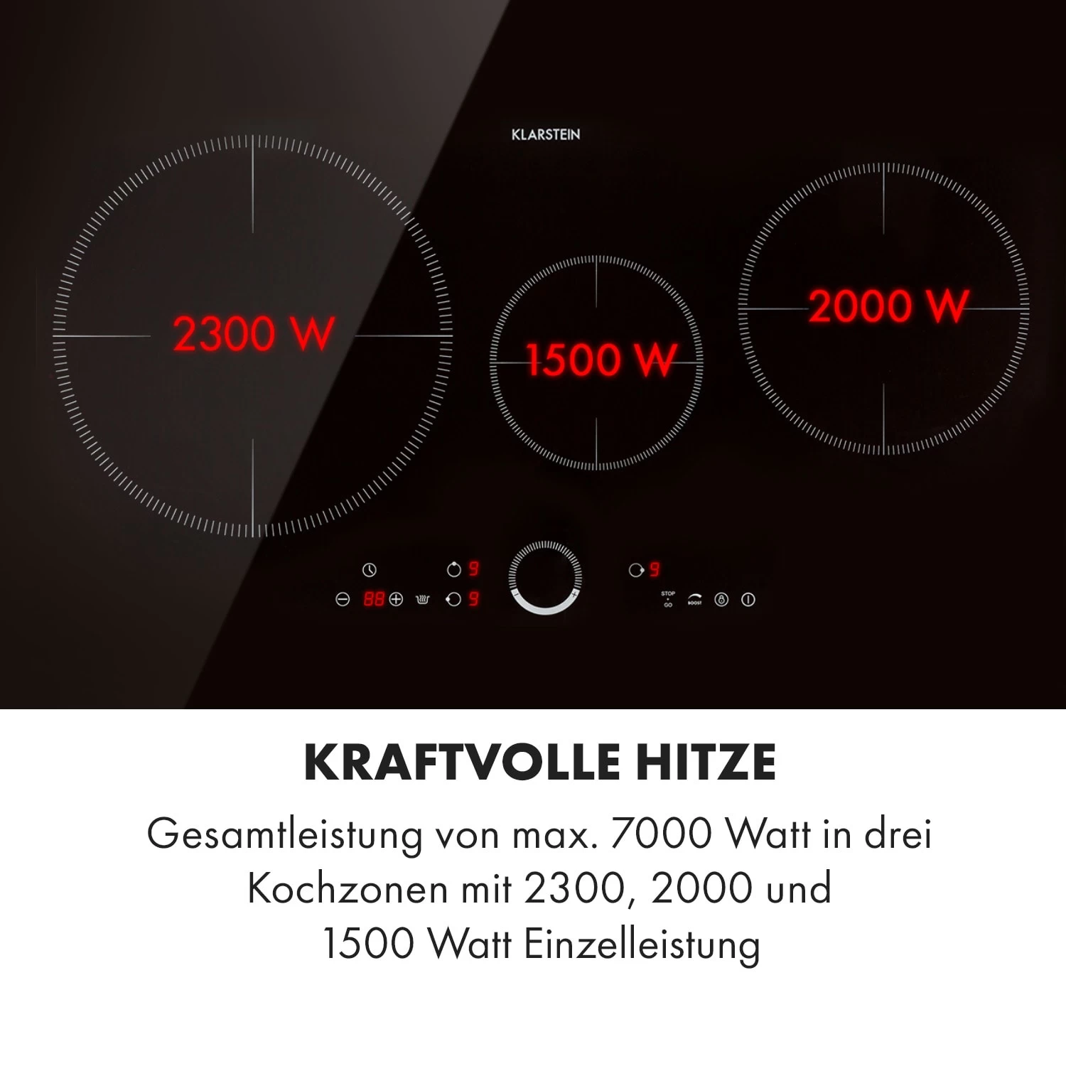- Gesamtleistung: max. 7400 W (2300 W, 2000 W & 1500 W)