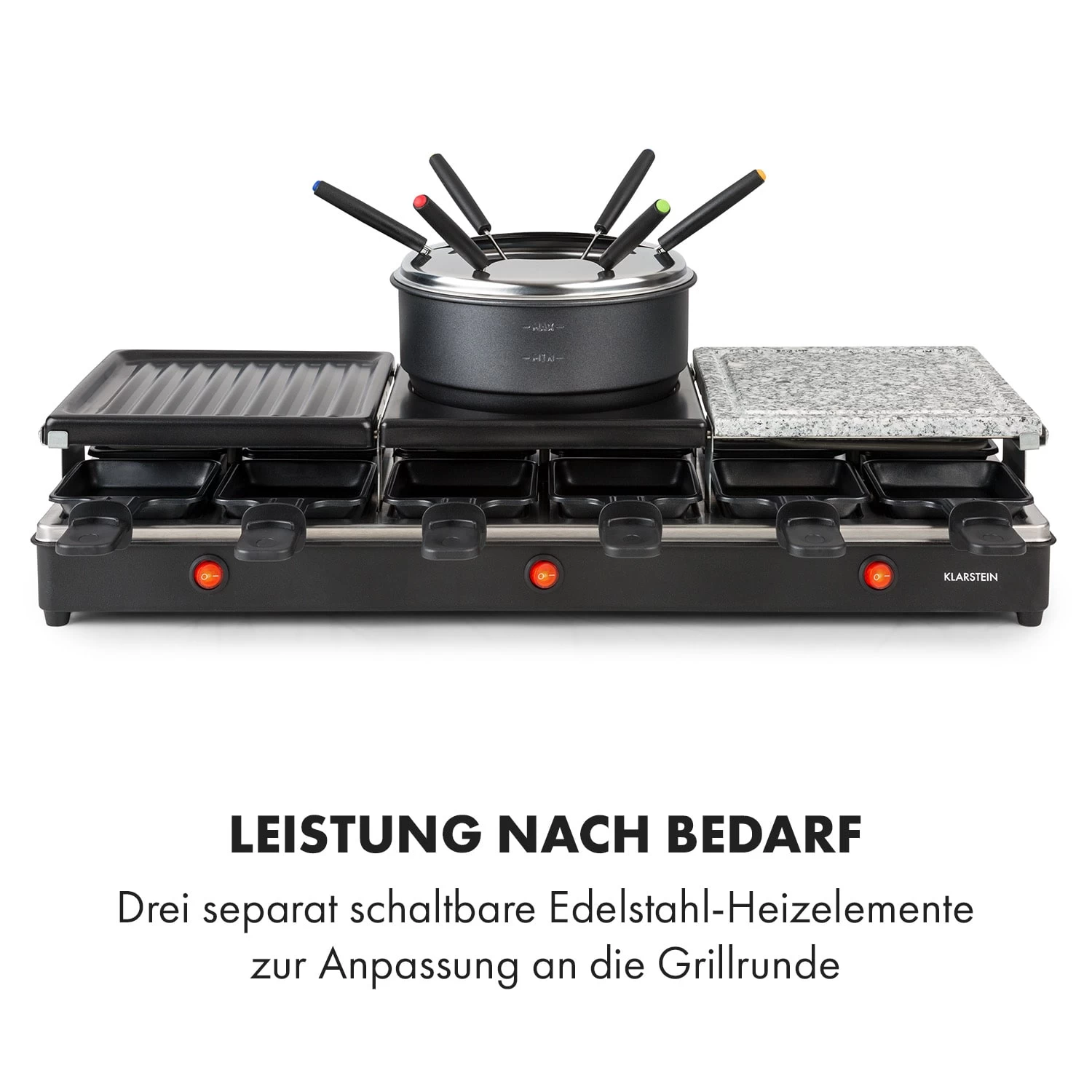 1650 Watt Heizleistung sorgen für eine schnelle Erhitzung des Raclette-Grills. Besonders praktisch ist dabei die Dreiteilung der Heizelemente, die jeweils separat geschaltet werden können. So ist auch wirklich nur der Teil des Grills in Betrieb, der auch benötigt wird. Damit sich niemand an dem hitzigen Fonduelette XL von Klarstein die Finger verbrennt, sind alle Pfännchen und Fonduegabeln mit wärmeisolierten Handgriffen ausgestattet. Nach einer erlebnisreichen Mahlzeit erleichtern die abnehmbaren Grillplatten und Fonduebestandteile die Reinigung des Gerätes. So steht dem nächsten geselligen und unkomplizierten Essen mit Freunden und Familie nichts mehr im Weg.