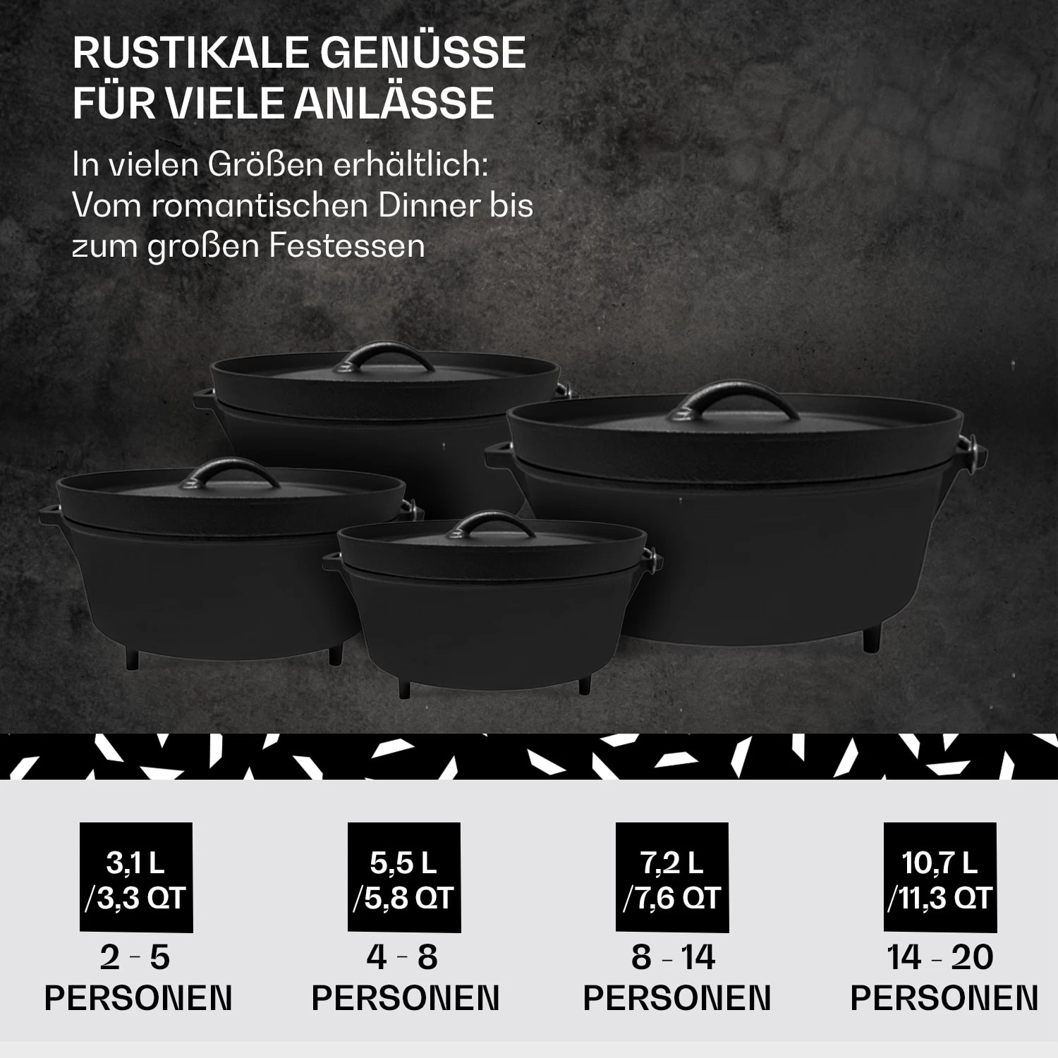 Immer ein heißes Eisen auf dem Feuer: Der Galloway BBQ Dutch Oven von Klarstein ist universell zum Kochen, Schmoren, Braten, Backen und Frittieren einsetzbar und kann mit Briketts, der Glut eines Lagerfeuers oder als Topf auf dem Grill erhitzt werden. Das rustikale Multitalent ist kochfertig voreingebrannt. Die Fertigung aus Gusseisen sorgt für eine optimale Wärmeverteilung. Der praktische Deckel mit hoher Krempe eignet sich zum Braten oder Servieren und kann auf dem mitgelieferten Ständer einfach abgelegt werden. Zur Nutzung im Lagerfeuer gibt es den Galloway BBQ Dutch Oven auch mit Standfüßen am Topf.
