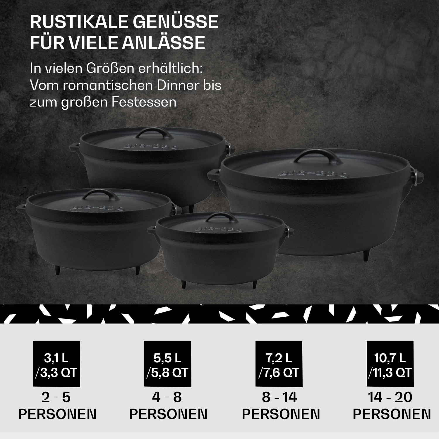 Immer ein heißes Eisen auf dem Feuer: Der Galloway BBQ Dutch Oven von Klarstein ist universell zum Kochen, Schmoren, Braten, Backen und Frittieren einsetzbar und kann mit Briketts, der Glut eines Lagerfeuers oder als Topf auf dem Grill erhitzt werden. Das rustikale Multitalent ist kochfertig voreingebrannt. Die Fertigung aus Gusseisen sorgt für eine optimale Wärmeverteilung. Der praktische Deckel mit hoher Krempe eignet sich zum Braten oder Servieren und kann auf dem mitgelieferten Ständer einfach abgelegt werden. Zur Nutzung im Lagerfeuer gibt es den Galloway BBQ Dutch Oven auch mit Standfüßen am Topf.