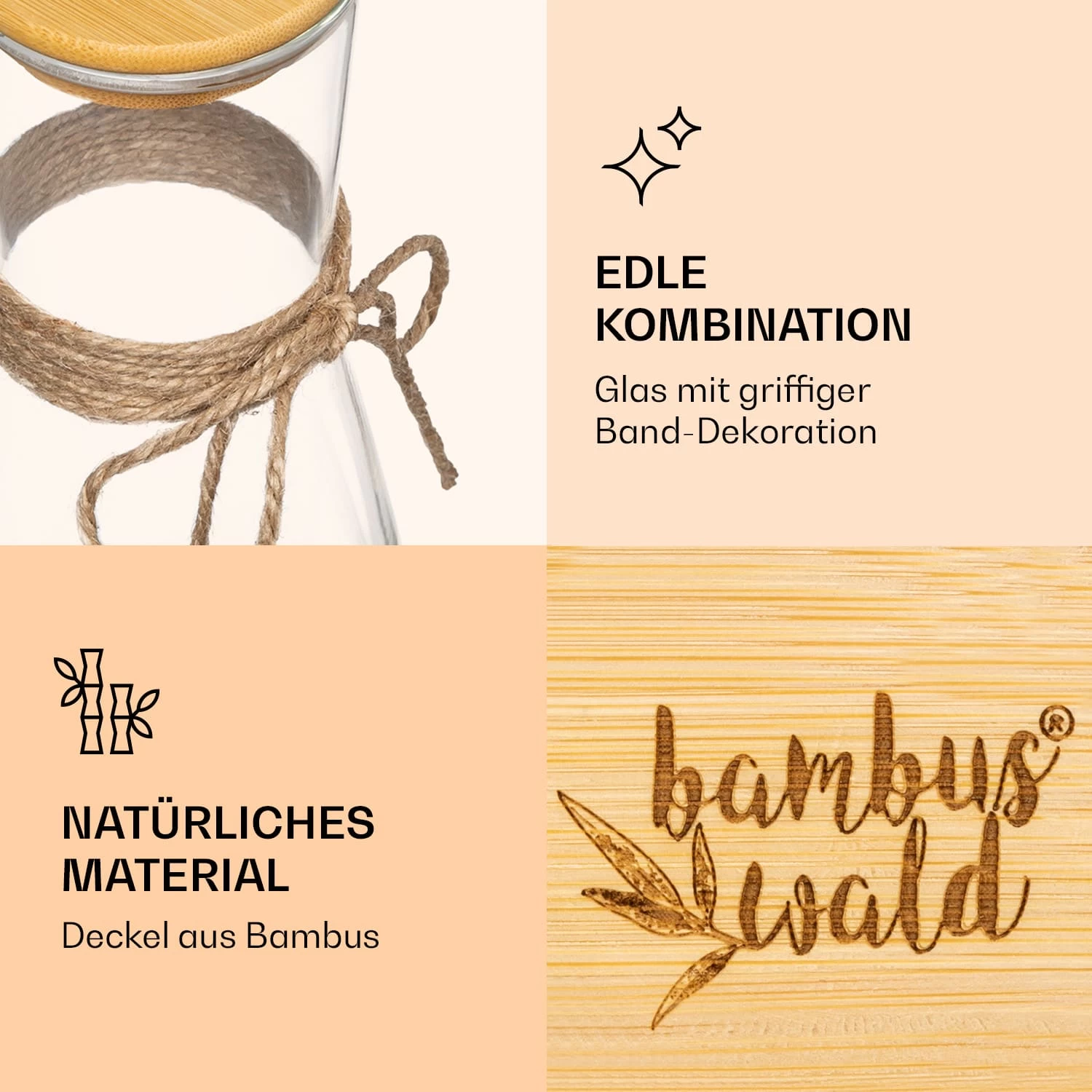 Heiße und kalte Getränke stilvoll genießen: Die elegante Glaskaraffe von Bambuswald ist eine Bereicherung für jede Küche. Der rund geschliffene Bambusdeckel hält Heißgetränke länger warm und schützt im Sommer vor Insekten. Die ansprechende Band-Dekoration sorgt für einen griffigen Halt und verleiht dem Behälter einen rustikalen und ländlichen Flair. Die Fertigung aus Borosilikatglas macht das Glasgefäß zudem besonders stabil und beständig.