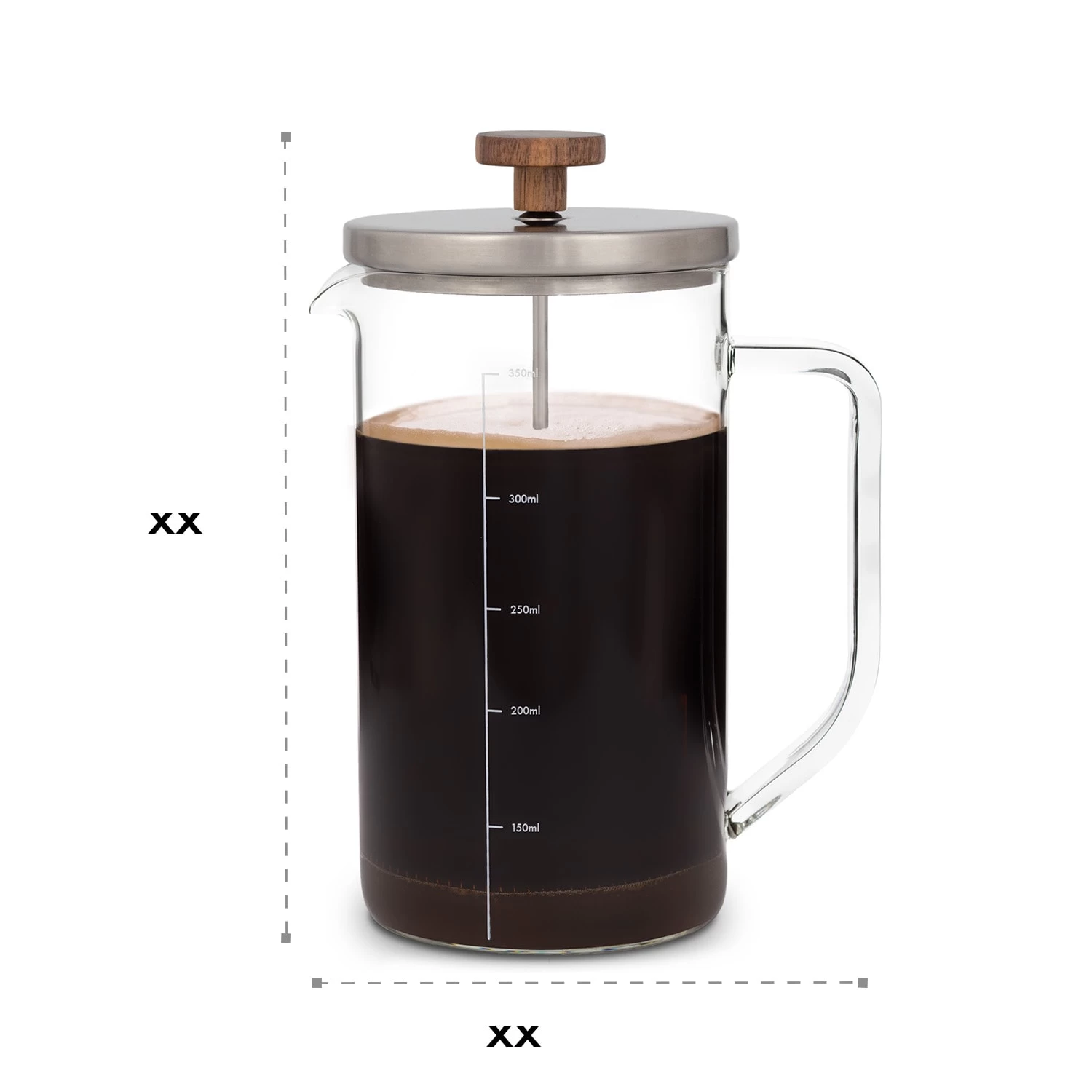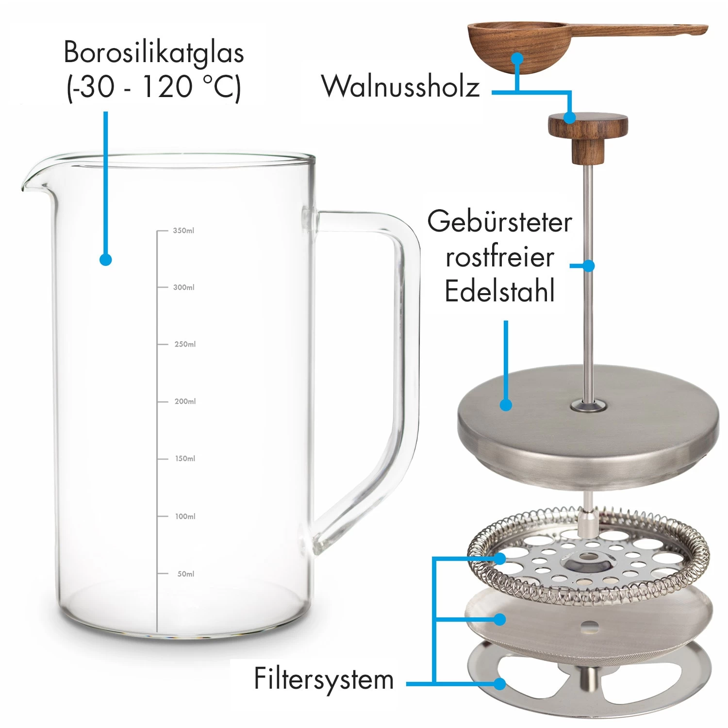 Mit einem Volumen von 0,35 Litern können in der Kaffeepresse von Klarstein problemlos bis zu 2 Tassen Kaffee zubereitet werden. Dank dem extra langen Filterstab aus rostfreiem, gebürstetem Edelstahl lässt sich der Kaffeesatz bis ganz an den Boden pressen und ermöglicht dadurch auch das Aufbrühen von nur einer Tasse. Die Fertigung aus bruchsicherem und hitzebeständigem Borosilikatglas sorgt für die maximale Langlebigkeit deiner Cafetière, die mit einem eleganten Deckel aus Edelstahl und einem Griff aus Walnussholz versehen ist. Auch der mitgelieferte Messlöffel besteht aus Walnussholz und hilft dabei, zuverlässig das richtige Verhältnis von Kaffee und Wasser ohne Abwiegen zu finden. Das Filtersystem kann zudem einfach abgeschraubt werden und ermöglicht dadurch eine bequeme und gründliche Reinigung aller Einzelteile.