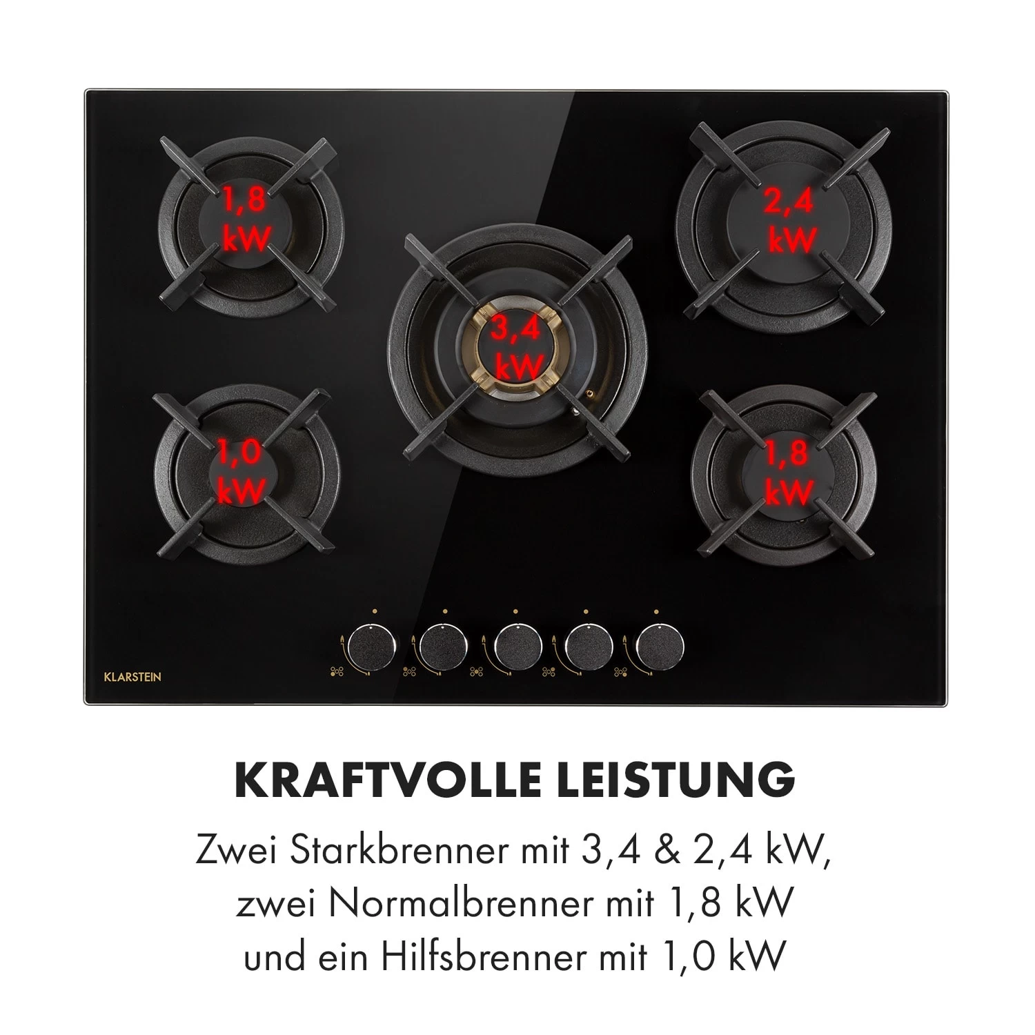 Goldflame 5 Gaskochfeld 5-flammig Messing-Brenner Glaskeramik Schwarz