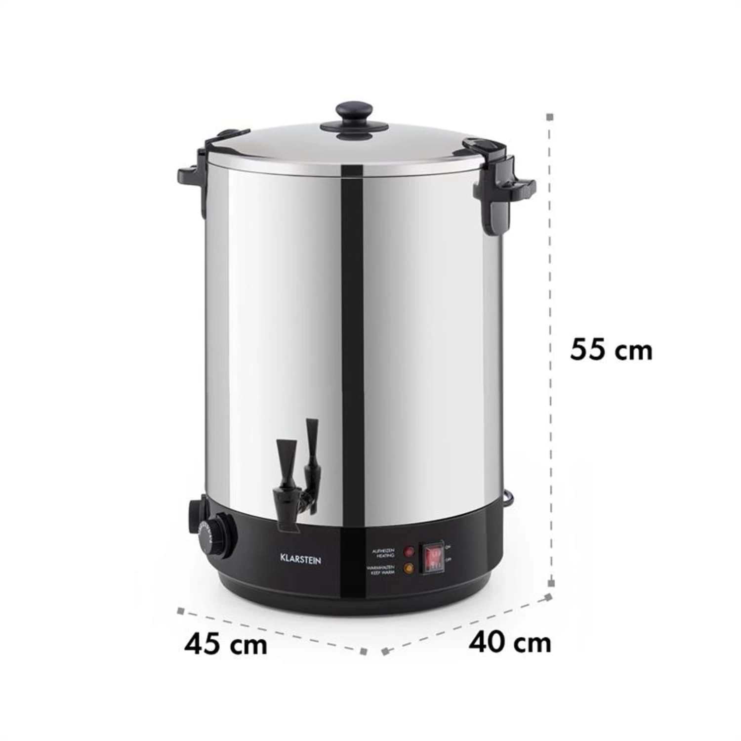 Damit sind die Fähigkeiten von Klarsteins KonfiStar 40 jedoch noch nicht erschöpft. Dank seines geschmacksechten und hygienischen Innenlebens aus Edelstahl, dem Cool-Touch-Ablasshahn sowie der integrierten Warmhaltefunktion eignet er sich auch vorzüglich als Heißgetränkespender für heißen Tee, Punsch oder Glühwein und bereichert so Parties, Buffets oder Konferenzräume.