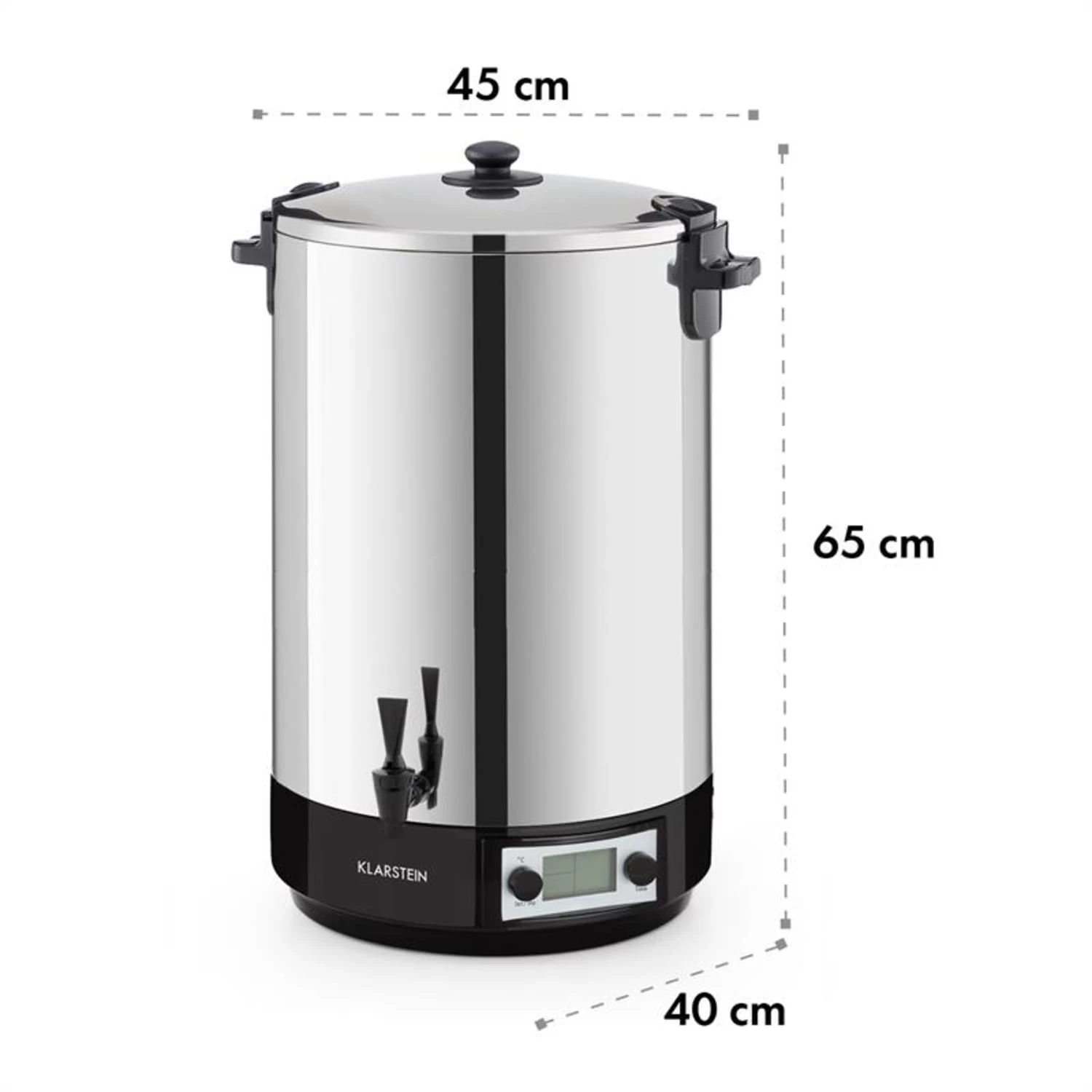 Damit sind die Fähigkeiten von Klarsteins KonfiStar 50 Digital jedoch noch nicht erschöpft. Dank seines geschmacksechten und hygienischen Innenlebens aus Edelstahl, dem Cool-Touch-Ablasshahn sowie der integrierten Warmhaltefunktion eignet er sich auch vorzüglich als Heißgetränkespender für heißen Tee, Punsch oder Glühwein und bereichert so Parties, Buffets oder Konferenzräume.