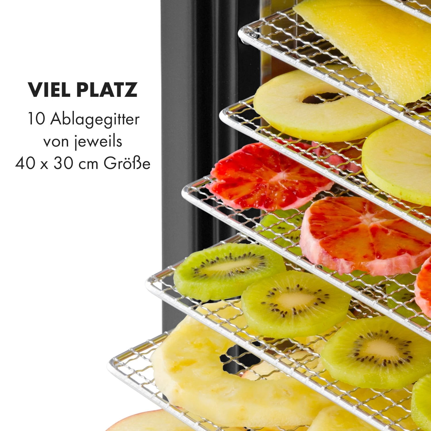 Ideal für große Mengen: Auf 10 Dörrebenen von 40 x 30 cm Größe kann das Dörrgut ohne großen Aufwand getrocknet werden. Für die richtige Dörrdauer steht ein in 30-Minuten-Schritten programmierbarer Timer bereit. Die Reinigung des Dörrautomaten nach Beendigung des Trockenvorgangs ist völlig unkompliziert: Die verchromten Metallablagegitter lassen sich problemlos abspülen. Ein herausnehmbares Bodenblech fängt abtropfenden Fruchtsaft und Krümel zur einfachen Beseitigung auf. Das Metallgehäuse mit Glastür und dem gut ablesbaren LC-Touch-Display ist dank des eleganten Designs ein Schmuckstück in jeder Küche.