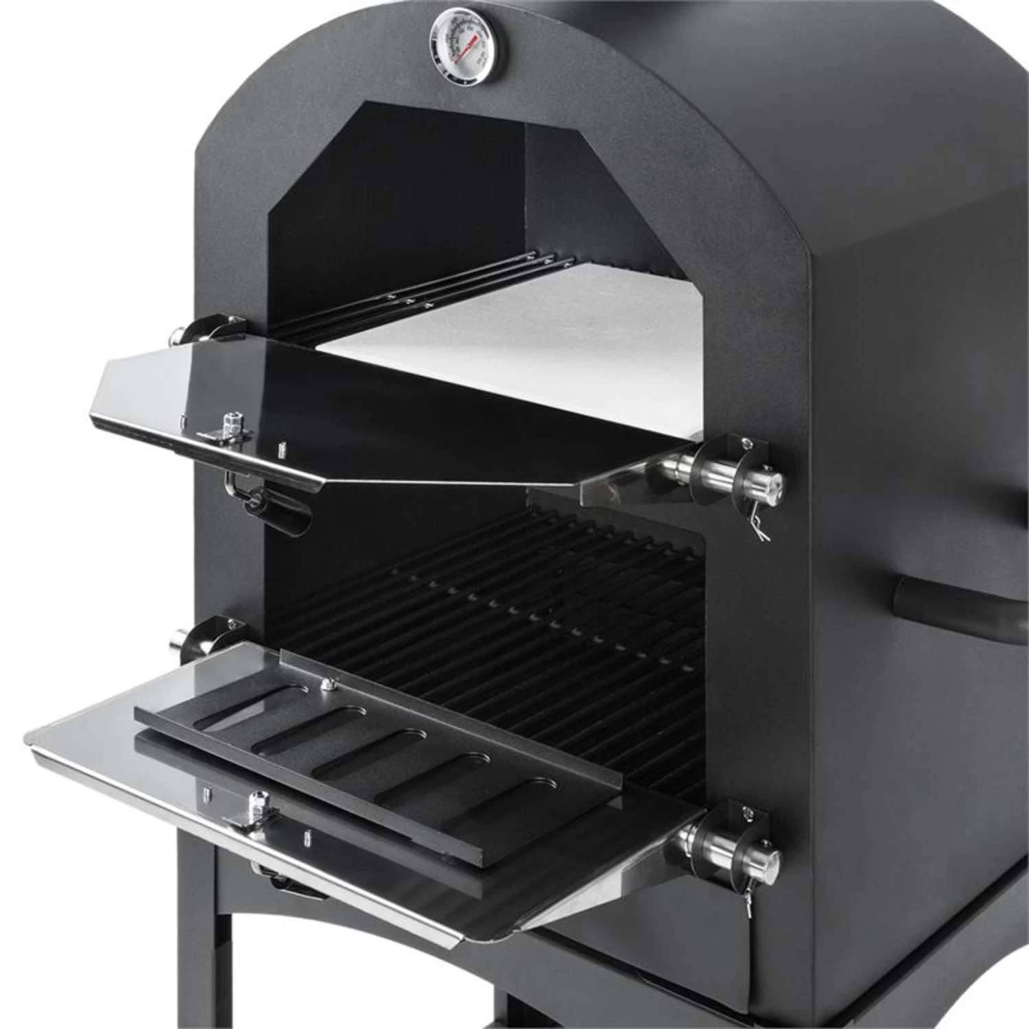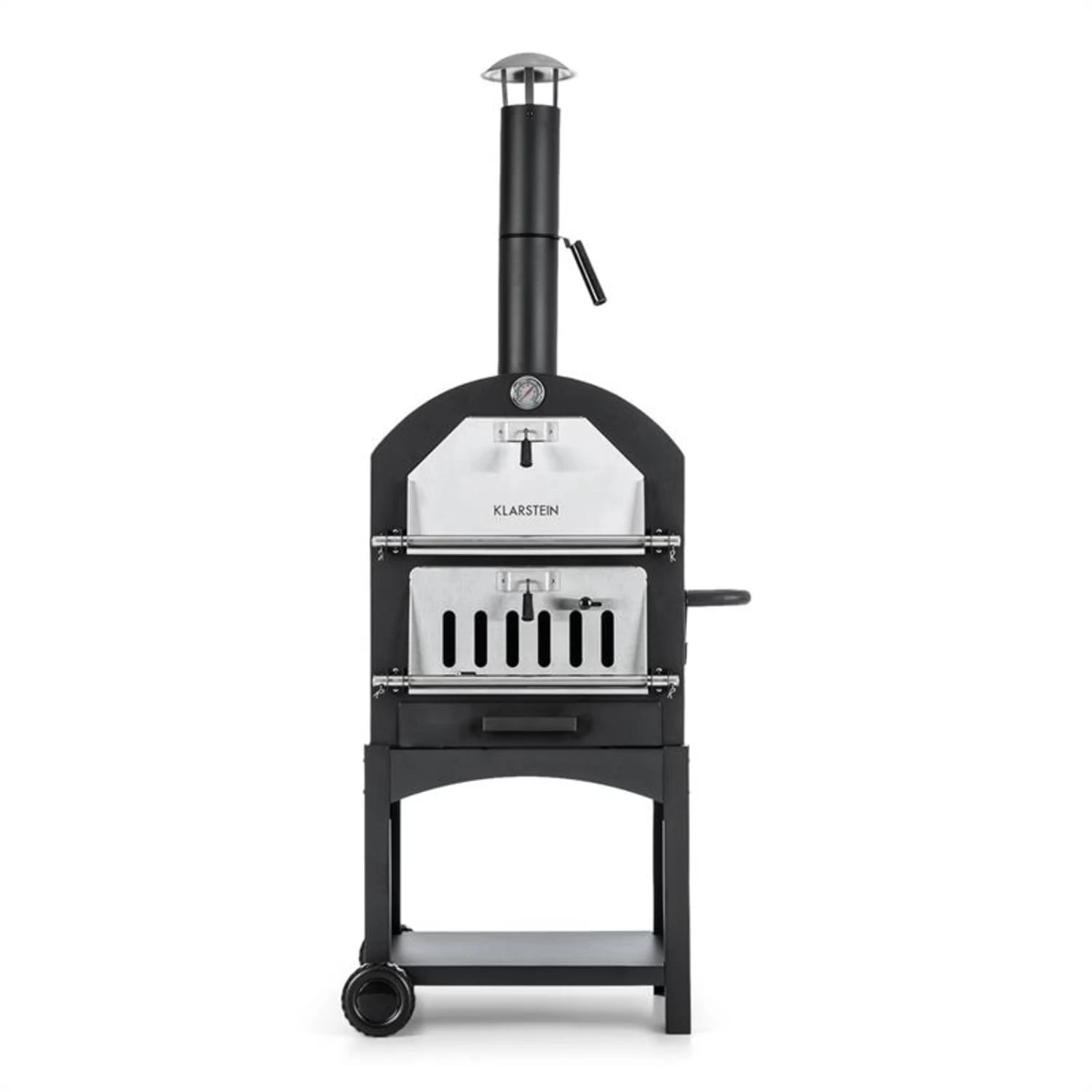 Leckere Pizza auf dem Stein gebacken oder knuspriges Holzofenbrot, mit dem Klarstein Pizzaiolo Perfetto Grillofen gelingen italienische Spezialitäten genauso wie rustikale Broterlebnisse! Auf Holz oder Holzkohle backen die Köstlichkeiten entweder auf dem 30,5 x 30,5 cm großen Schamott-Stein oder direkt auf dem 2-teiligen, 50 x 35 cm Edelstahl-Rost. Natürlich kann der Outdoor-Backofen nicht nur Teig: Auch BBQ-Gerichte wie Pulled Pork, Spare Ribs oder Burger gelingen in seinem Inneren. Für die einfache Überwachung der richtigen Gar-Temperatur sorgt das integrierte Thermometer. So weiß der Grillchef immer, wann er die Lüftungsschieber öffnen oder schließen muss. Durch die Materialdicke von 1,2 mm Stahl ist der Grill nicht nur äußerst robust, sondern speichert auch langfristig die Wärme und erzielt so noch bessere Grillergebnisse.