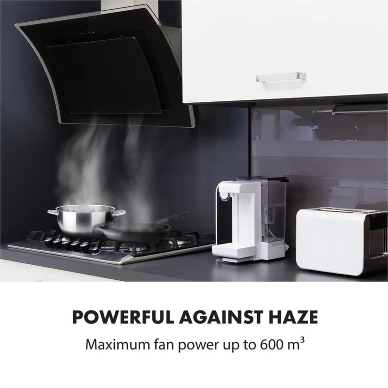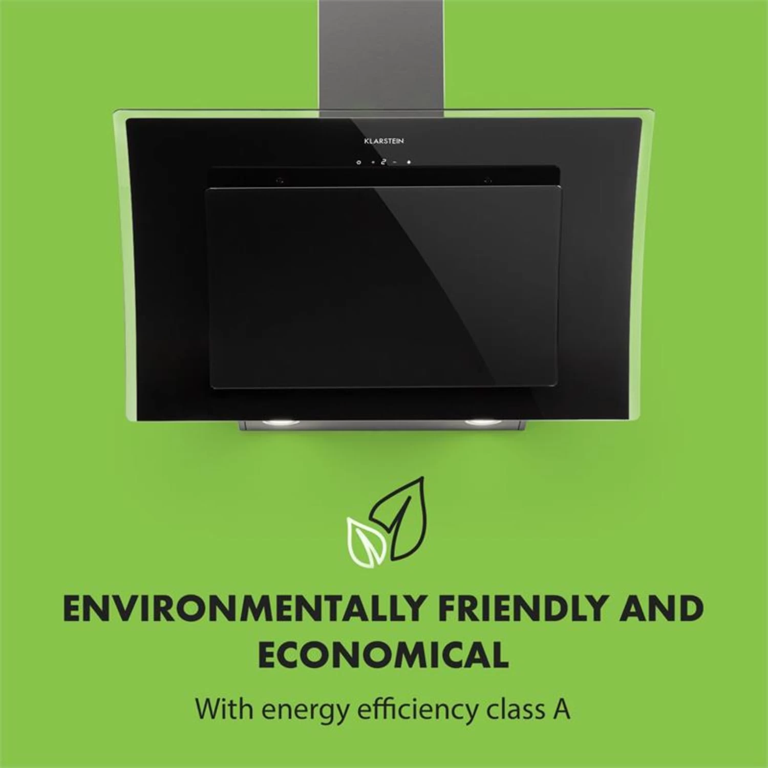 Besonderen Reiz erlangt die Klarstein Sabia Dunstabzugshaube nicht zuletzt durch ihr inwärts geschwungenes Design sowie das verwendete schwarze Sicherheitsglas. So verleiht die kopffreie Wandabzugshaube jeder Küchenzeile einen Hauch von Luxus. Zwei zuschaltbare Kochflächenlampen verleihen ihr dabei nicht nur zusätzlichen Glanz, sondern ermöglichen auch den ungetrübten Blick in Pfannen und Töpfe. Damit nichts die edle Oberfläche durchbricht, sind sämtliche Bedienelemente als Touchpanel mit Display direkt in die Glasfläche integriert.