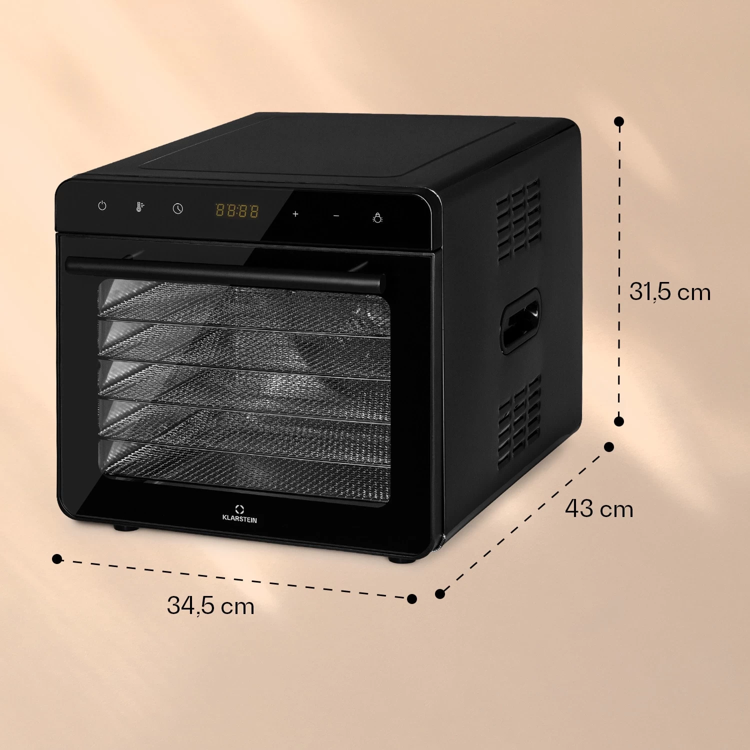 Der leistungsstarke Klarstein Shaftesbury Dörrautomat trocknet Obst, Gemüse, Fleisch und andere Lebensmittel im Rekordtempo und stellt damit leckere, haltbare Snacks und Zutaten her. Auf seinen 6 Metallgittern lassen sich vitaminreiche Trockenfrüchte wie Apfel- und Bananenchips oder gesundes Gemüse wie getrocknete Tomaten bestens bis zur geschmacklichen Perfektion zubereiten. Dabei hilft der einstellbare Timer zwischen 0 und 24 Stunden sowie das Ventilationssystem, das für eine gleichmäßige Verteilung der Hitze im gesamten Innenraum sorgt.