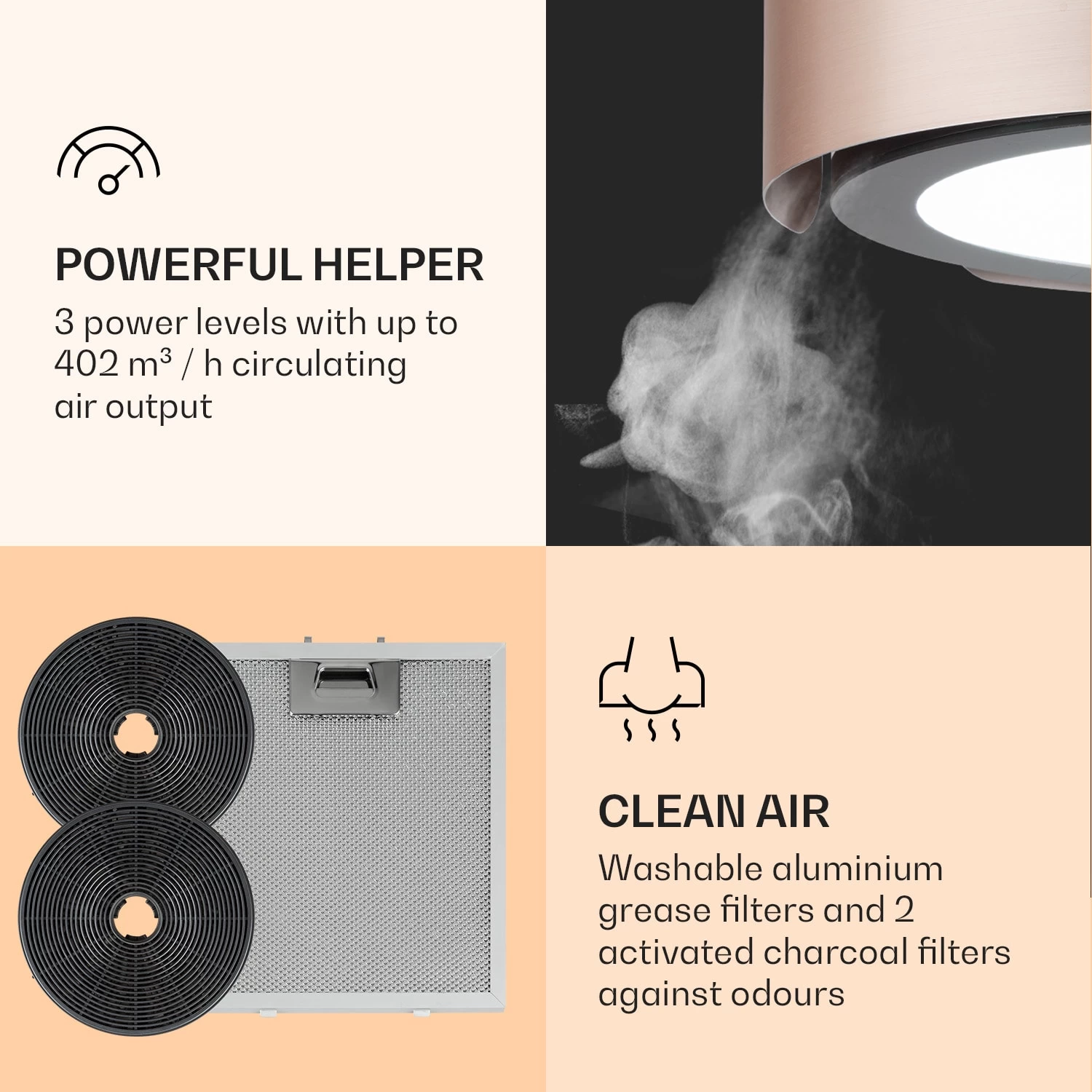 In drei Leistungsstufen wälzt sie mit bis zu 402 m³/h Luftstrom den Dampf unermüdlich um und befreit so deine Küchenluft von Fett und Gerüchen. Eine integrierte LED-Kochflächenbeleuchtung sorgt für ein gut ausgeleuchtetes Kochgeschehen, während über den frontseitigen, illuminierten Touch-Drehregler mit Digitalanzeige umstandslos eine der drei Leistungsstufen gewählt wird. Zusätzlich kannst du die Inseldunstabzugshaube via Klarstein-App oder Gestensteuerung bedienen.