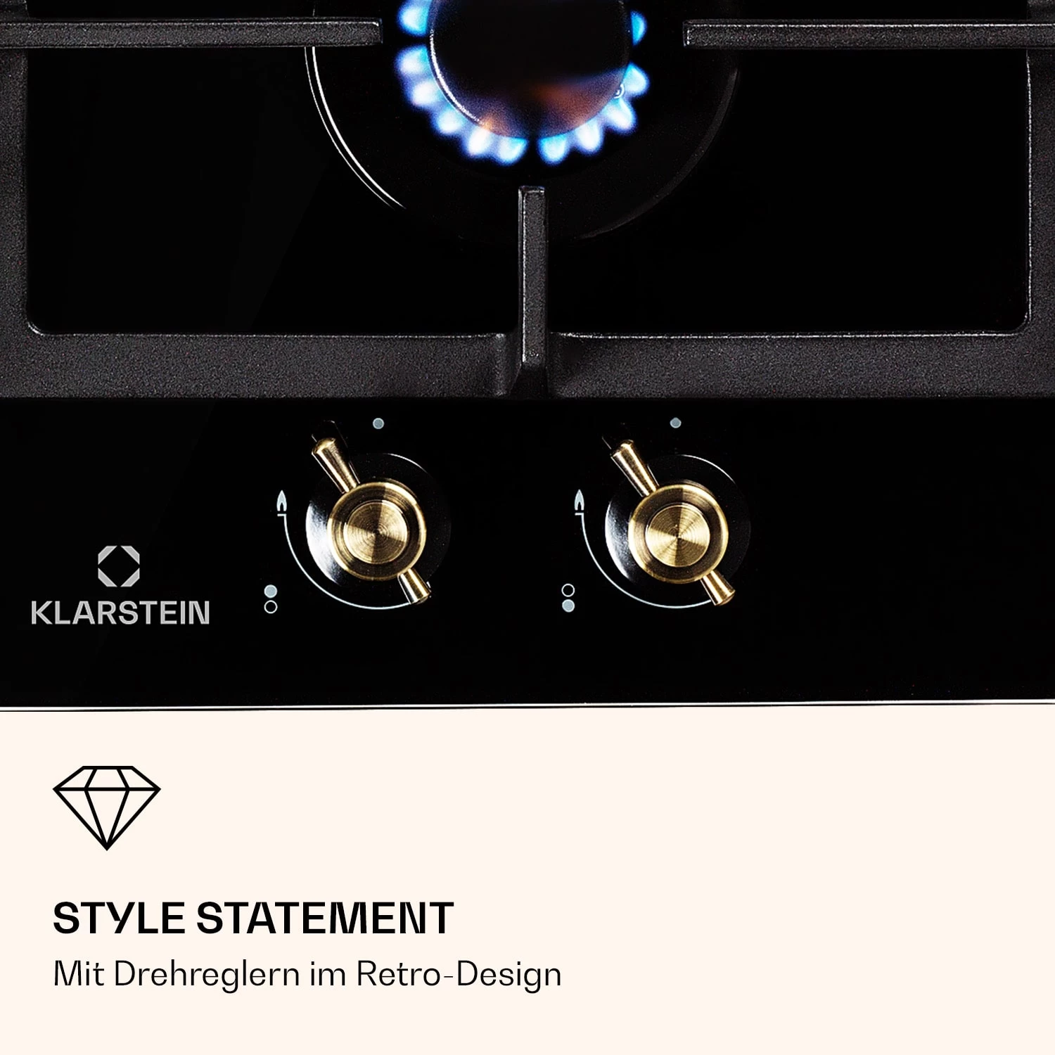 Auf dem platzsparenden Klarstein Victoria Domino Gaskochfeld befinden sich zwei hochwertige Sabaf-Brenner, die mit einer Leistung von 3 kW und 1 kW ordentlich einheizen. Die Brenner verteilen die Hitze gleichmäßig in der Mitte und an den Rändern deines Kochgeschirrs, so wird alles perfekt gegart. Die Bedienung ist dank der selbsterklärenden Symbole an den großen im Retro-Design gestalteten Drehknöpfen absolut intuitiv, die Hitzezufuhr kann während des Kochvorgangs immer wieder direkt angepasst werden. Via SnapJetIgnition entzündest du die Flamme, somit ist kein zusätzliches Feuer nötig. Das abnehmbare Kreuz aus massivem Gusseisen sitzt passgenau und kippsicher über den Flammen. Das Kochfeld ist mit einer gehärteten, pflegeleichten Keramikglas-Beschichtung versehen, die nicht nur gut aussieht, sondern auch besonders leicht zu reinigen ist.