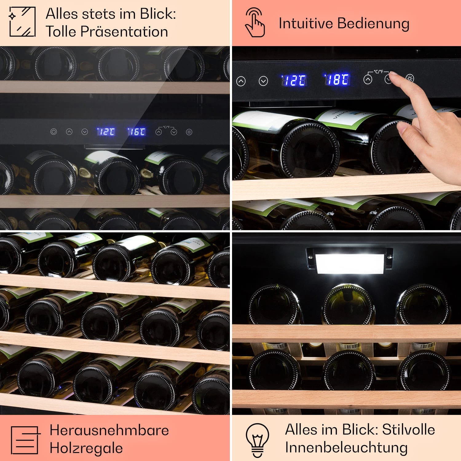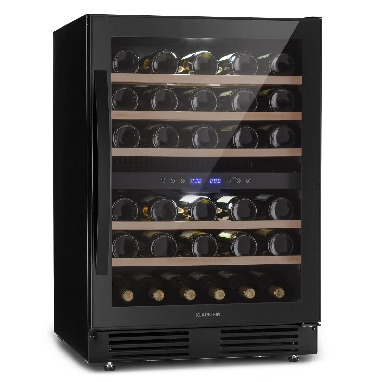 Edles Design und Präsentation: Der Klarstein Vinovilla 50 Duo Doppelzonen-Weinkühlschrank macht deinen Wein auch optisch zum Genuss! Seine zwei Zonen kannst du separat temperieren, was dir eine zeitgleiche Kühlung und Lagerung von Rot- und Weißweinen bei Trinktemperatur ermöglicht. Aber auch Champagner, Schaumweine, Sekt oder andere delikate Tropfen lagern im Weintemperierer langfristig optimal. Neben besten Lager- und Kühlungsverhältnissen bietet er deiner Weinsammlung eine extravagante Bühne: Hinter UV-Glas präsentieren sich die Flaschen wunderbar auf ihren fünf Buchenholzregalen und können bei Bedarf stilvoll beleuchtet werden. Niedriges Betriebsgeräusch, Anti-Vibrations-Bauweise und ein integrierter Aktivkohlefilter runden die Weinlagerung gekonnt ab.